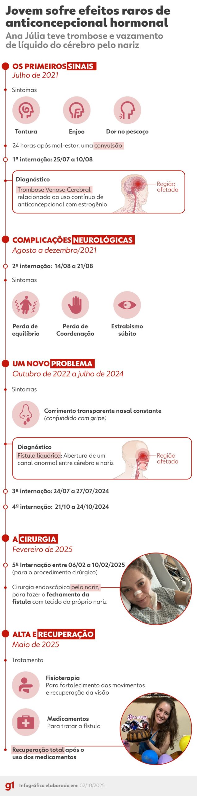Com o tempo, o quadro se agravou. A trombose elevou a pressão dentro do crânio e em outubro de 2022, mais de um ano após o diagnóstico, Ana Júlia notou um novo sintoma: um corrimento nasal transparente persistente.