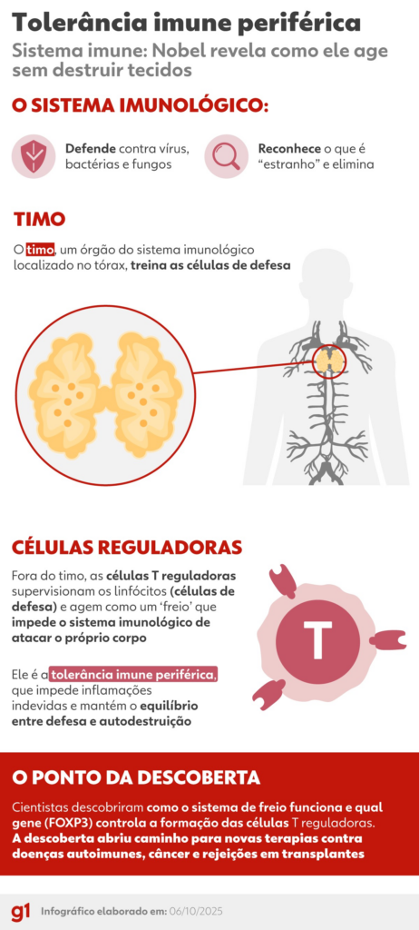 “O sistema imune tem dois níveis de tolerância, ou seja, de capacidade de não agredir o próprio organismo. O primeiro é o central, no timo. Mas há também o periférico, que atua como um freio para conter respostas exageradas. Sem ele, o corpo se volta contra si mesmo; com excesso, pode proteger tumores”, explica Cristina Bonorino, coordenadora do Laboratório de Imunoterapia da Universidade Federal de Ciências da Saúde de Porto Alegre.