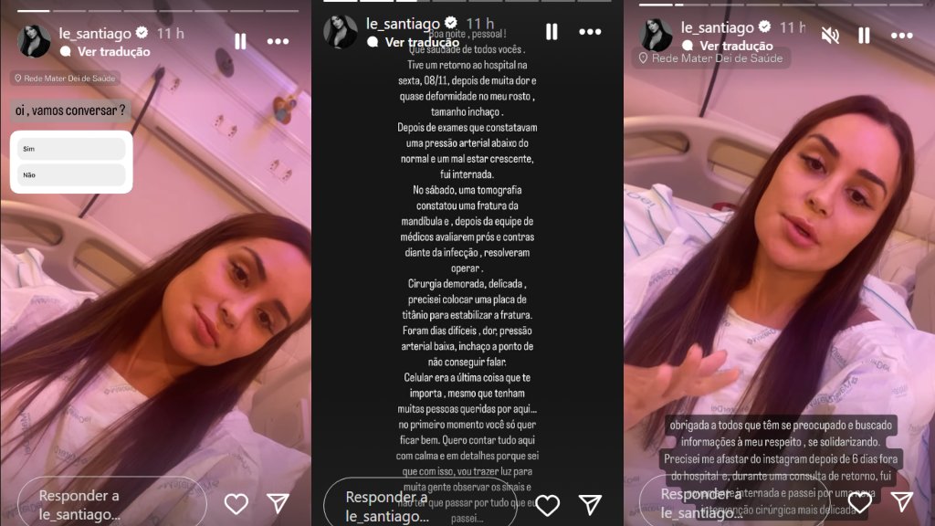 Ela continuou explicando que, no sábado (9), uma tomografia revelou a fratura na mandíbula. Após avaliar os riscos da infecção, a equipe médica decidiu realizar a cirurgia, na qual a influenciadora precisou colocar uma placa de titânio para estabilizar a fratura.